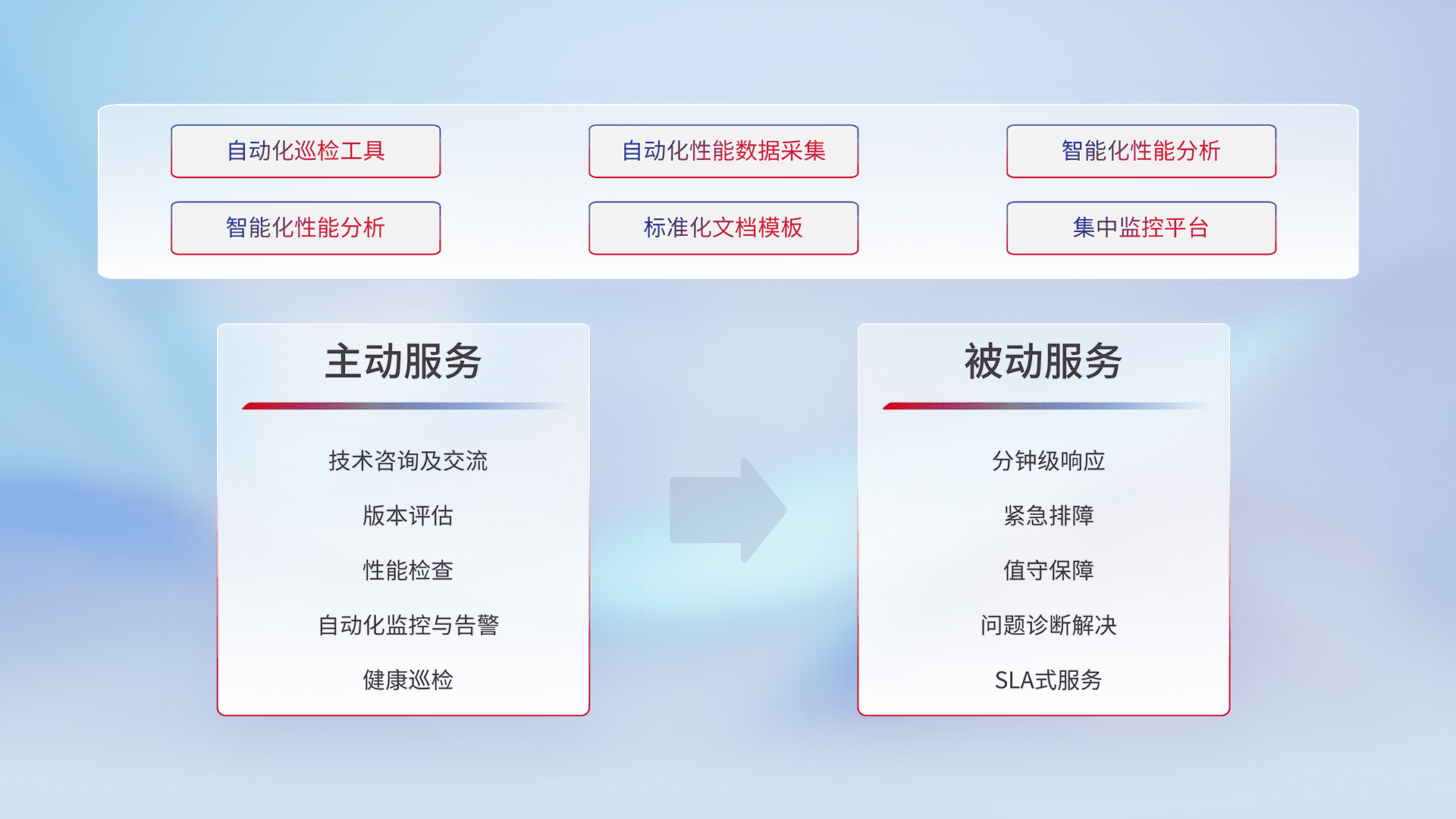 智能化工具和标准化文档,,保障服务质量,,,提供主动服务(包含技术咨询、、版本评估、、、、性能检查、、、自动化监控与告警、、健康巡检)和被动服务包含(分钟级响应、、紧急排障、、值守保障、、、问题诊断解决、、、、SLA服务)。。